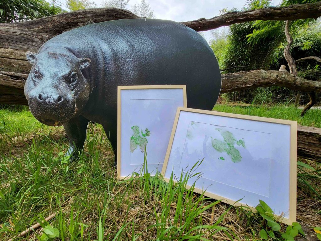 Diese einzigartigen Kunstwerke sind durch die farbigen Fußabdrücke der Zwergflusspferde Atu und Ayoka im Rahmen des medizinischen Trainings entstanden. Die verwendeten Fingerfarben stammen aus dem Malbedarf für Kinder. Sie sind dermatologisch getestet, vegan und lösen sich beim Kontakt mit Wasser sofort.