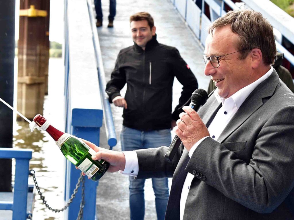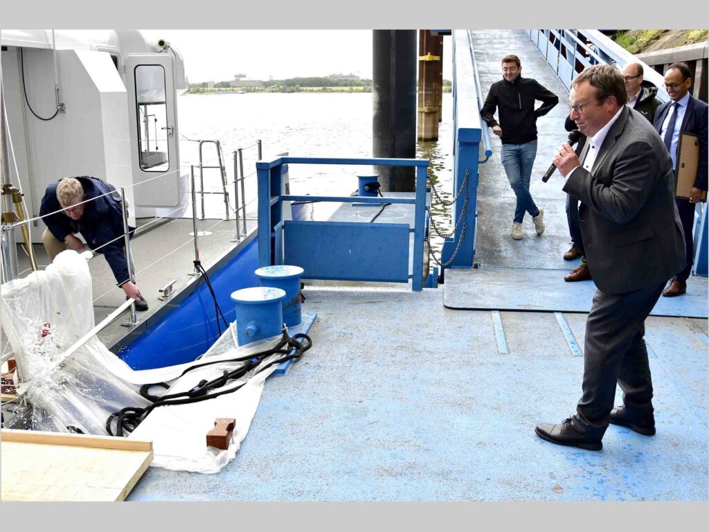 Mit glänzenden Solarzellen auf dem Dach und einem nahezu verwaistem Steuerstand ist die NOVA alles andere als ein gewöhnliches Schiff. Der Katamaran ist eine schwimmende Forschungsplattform. An Bord erarbeiten Wissenschaftler:innen der Universität Duisburg-Essen und des JRF-Instituts Entwicklungszentrum für Schiffstechnik und Transportsysteme (DST) zukunftsfähige Konzepte: Wie können alternative Antriebe die Umwelt entlasten? Und wie lässt sich die Schifffahrt sicher autonom betreiben? NOVA wurde heute feierlich durch NRW-Verkehrsminister Oliver Krischer in Ruhrort getauft.
