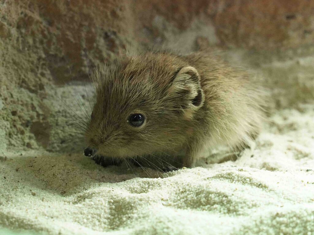 Nur einen Tag später, am 5. Juli 2025, wurde im E-Center Schroff-Afrikaterrarium ein weiterer besonderer Nachwuchs geboren: ein Kurzohrrüsselspringer. Diese faszinierenden Tiere sind mit Elefanten verwandt und gehören zu den sogenannten Nestflüchtern – bereits kurz nach der Geburt sind sie voll behaart, haben geöffnete Augen und sind erstaunlich mobil.